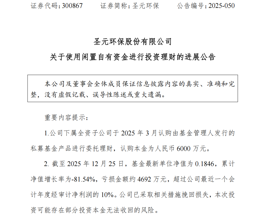 圣元环保(300867)今日晚间公告,公司下属全资子公司委托理财出现重大亏损。公告显示,子公司认购的6000万元私募基金产品累计亏损达81.54%,亏损金额超过年净利润的10%。公司已采取报警、举报、法律诉讼等一系列措施挽回损失,相关事项可能对公司2025年度经营业绩产生较大影响。