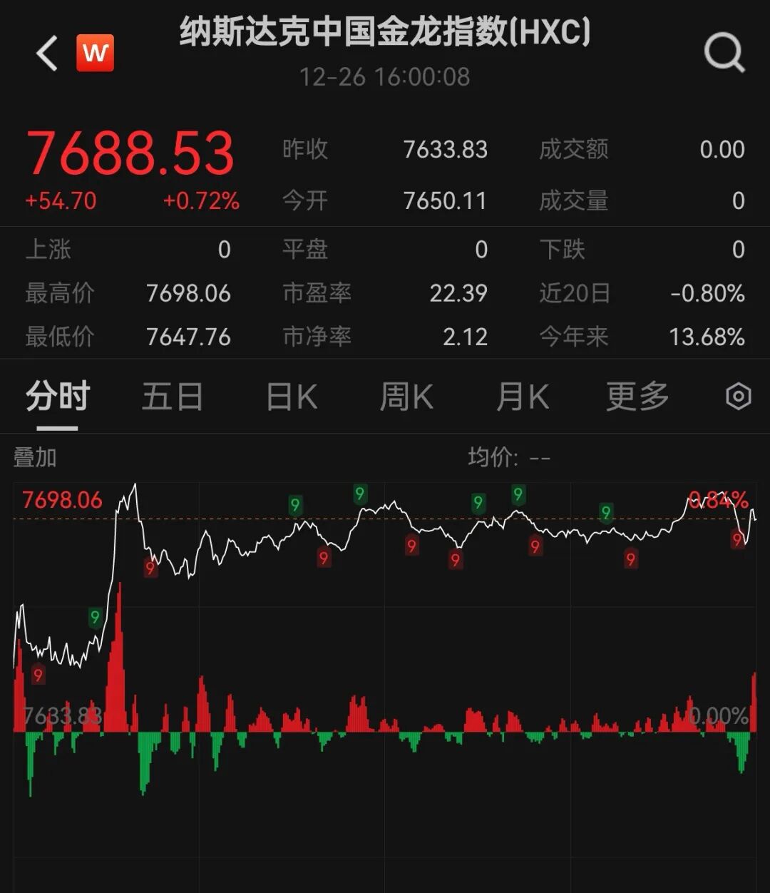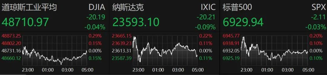 截至12月26日收盘,美股三大指数均微跌,纳指跌0.09%,道指跌0.04%,标普500指数跌0.03%。纳指本周累计上涨1.22%;道指本周累计上涨1.2%;标普500指数本周累计上涨1.4%。