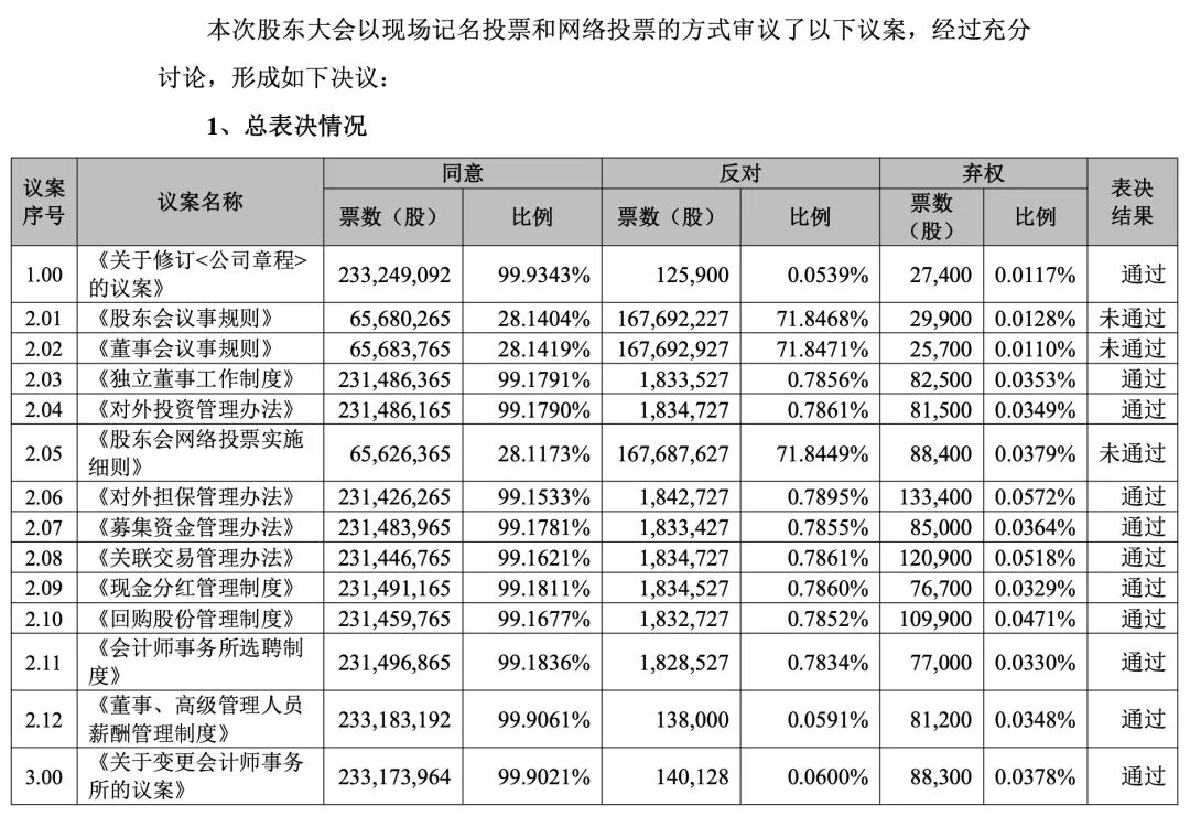 12月26日晚间,振芯科技披露了临时股东大会最终表决结果,此次会议审议通过了11项议案,其中,议案《关于修订<公司章程>的议案》经此次股东大会以特别决议审议通过。另有3项议案未获通过,分别为《股东会议事规则》、《董事会议事规则》、《股东会网络投票实施细则》。从表决情况来看,上述三项议案所得反对票均在1.68亿股左右,所占表决比例超过71.84%。