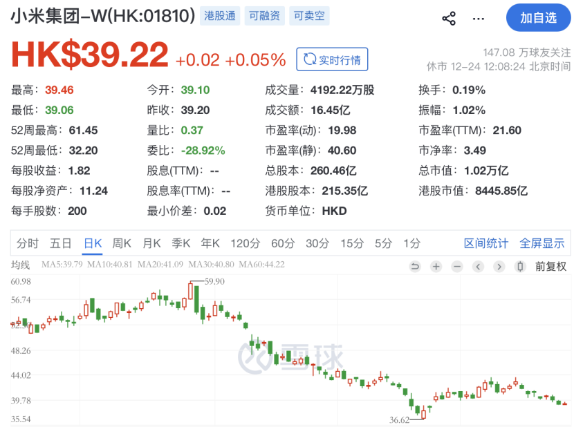 股价方面,今年9月下旬以来,小米集团股价持续调整,截至12月24日收盘,小米集团股价报39.22港元/股,相较于今年6月高点(61.45港元/股),累计跌幅超36%。