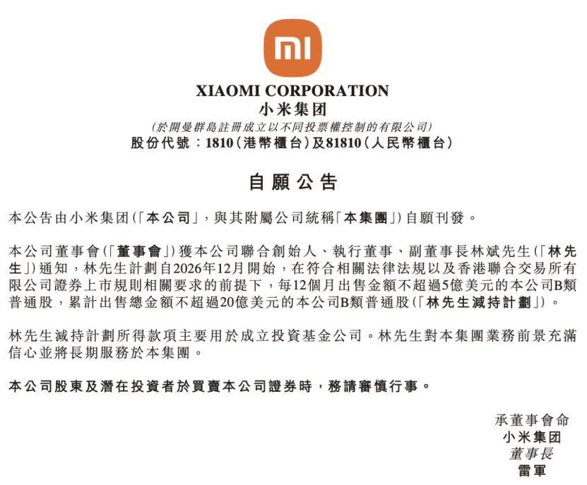 12月28日晚间,小米集团发布公告称,公司联合创始人、执行董事、副董事长林斌计划自2026年12月开始,每12个月出售金额不超过5亿美元的公司B类普通股,累计出售总金额不超过20亿美元(约合人民币140亿元)。