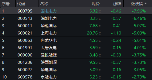 周一开盘以后,以火电为代表的电力股持续下行。其中,国电电力跌7.96%,皖能电力跌6.46%,华能国际、上海电力、内蒙华电等跌超5%。长江电力、华能水电等水电龙头也随之跟跌。