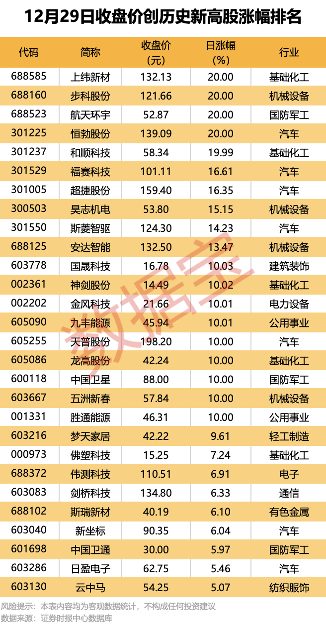 收盘价创历史新高股中,今日股价平均上涨7.71%,涨停或触及涨停的分别有上纬新材、步科股份、航天环宇等,涨幅居前的有福赛科技、超捷股份、昊志机电等。