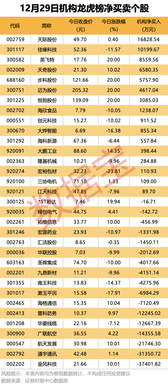 今日龙虎榜中,净买入个股有16只,净卖出的个股为17只。8股净买入金额均超千万元,天际股份获机构净买入1.68亿元,居首;其次是佳缘科技,机构净买入金额为1.02亿元。