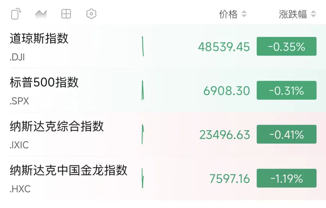 当地时间12月29日,美股三大股指全线低开,截至发稿,道指跌0.35%,标普500指数跌0.31%,纳指跌0.41%。