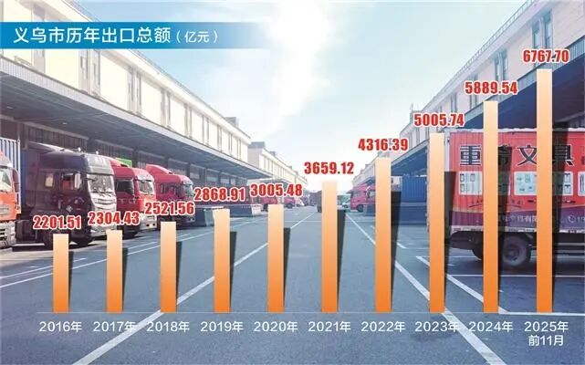 距离苏溪2公里之外,就是举世瞩目的义乌国际商贸城,这里也是海量包裹产生的源头。今年,义乌市场出口表现抢眼。前11个月出口额达到6767.7亿元,同比增长24.80%,超过了2024年全年5889.54亿元的出口总额。
