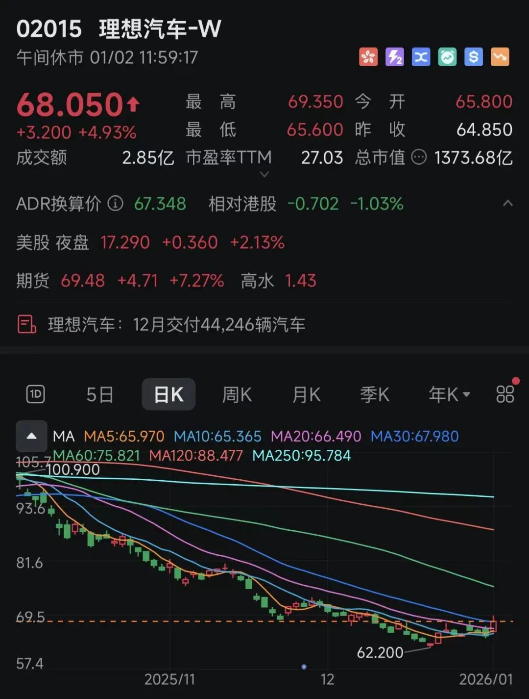 港股市场新能源汽车股集体上涨,其中,理想汽车一度涨近7%,小米、比亚迪股份,吉利汽车、小鹏汽车、零跑汽车跟涨。1月1日,理想汽车公布2025年12月交付数据。2025年12月,理想汽车交付新车44246辆。2025年第四季度,理想汽车交付10.92万辆。