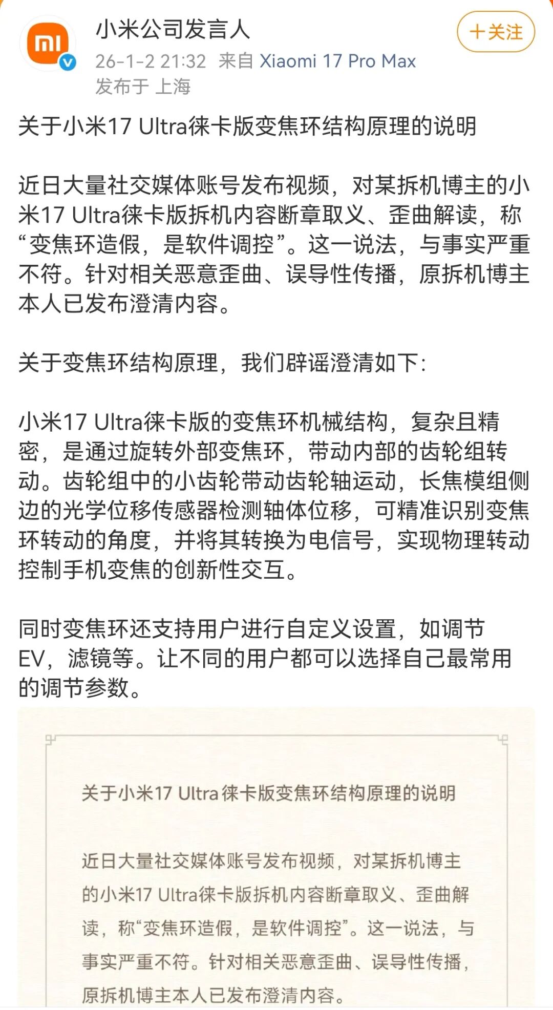 据“小米公司发言人”微博消息,近日大量社交媒体账号发布视频,对某拆机博主的小米17 Ultra徕卡版拆机内容断章取义、歪曲解读,称“变焦环造假,是软件调控”。这一说法,与事实严重不符。针对相关恶意歪曲、误导性传播,原拆机博主本人已发布澄清内容。