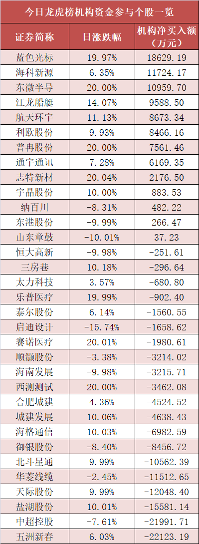 盘后龙虎榜数据显示,机构现身多股,其中蓝色光标等股票呈现机构资金净买入,五洲新春等股票呈现机构资金净卖出。