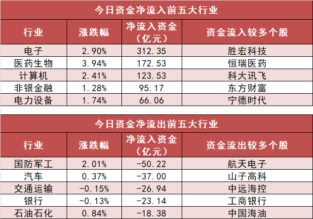 申万一级行业中,18个行业实现主力资金净流入,其中电子行业净流入312.35亿元居首。