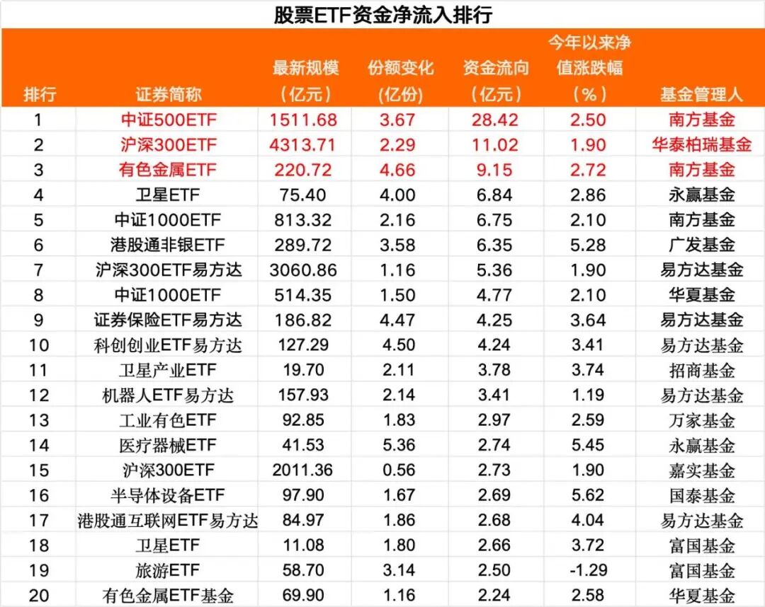 另据Wind数据显示,当日资金净流入前20大股票ETF中,宽基方面,除了南方中证500ETF单只净流入超过28亿元,3只沪深300ETF合计净流入接近20亿元;2只中证1000ETF合计净流入超过11.5亿元;行业主题方面,有色金属、卫星产业两大行业主题ETF各占3席,资金净流入分别超过14亿元和13亿元。
