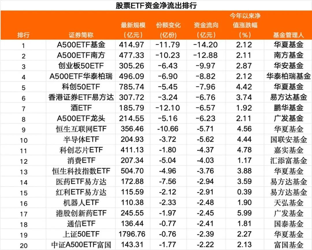大盘多日连阳后,部分资金选择兑现离场。周一全市场股票ETF(含跨境ETF)资金净流出超35亿元。中证500、沪深300、中证1000等宽基ETF,以及有色金属、卫星产业等行业主题ETF净流入靠前,中证A500、创业板50、科创50等宽基ETF,以及香港证券、酒、恒生互联网、半导体等行业主题ETF是资金净流出较多的品种。