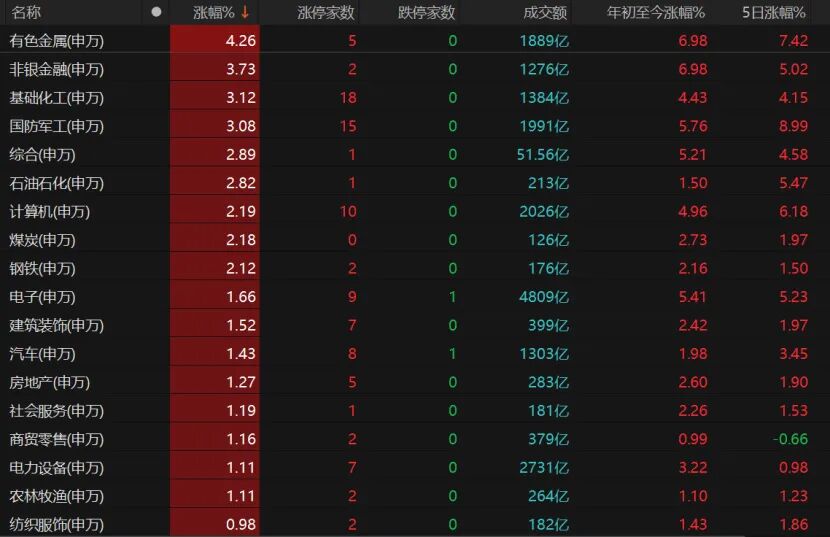 有色金属涨幅超过4%,利源股份、常铝股份、锡业股份、安宁股份、贵研铂业涨停;非银金融板块爆发,华林证券、华安证券涨停。