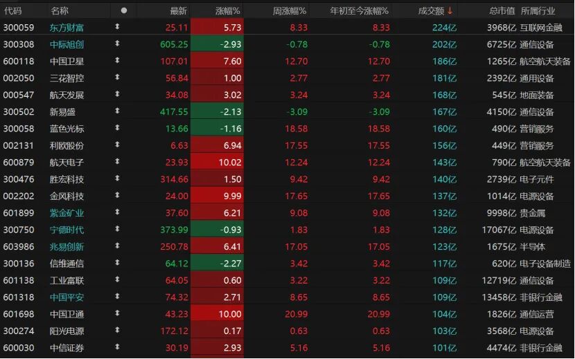 市场赚钱效应不错,4108只个股收涨,涨停股143只;1222只个股收跌,跌停股2只。20只个股日成交额超过100亿元,东方财富今日收涨5.73%报25.11元/股,日成交额224亿元;中际旭创跌近3%报605.25元/股,日成交额202亿元。中国卫星收涨7.6%,航天电子、金风科技、中国卫通涨停。
