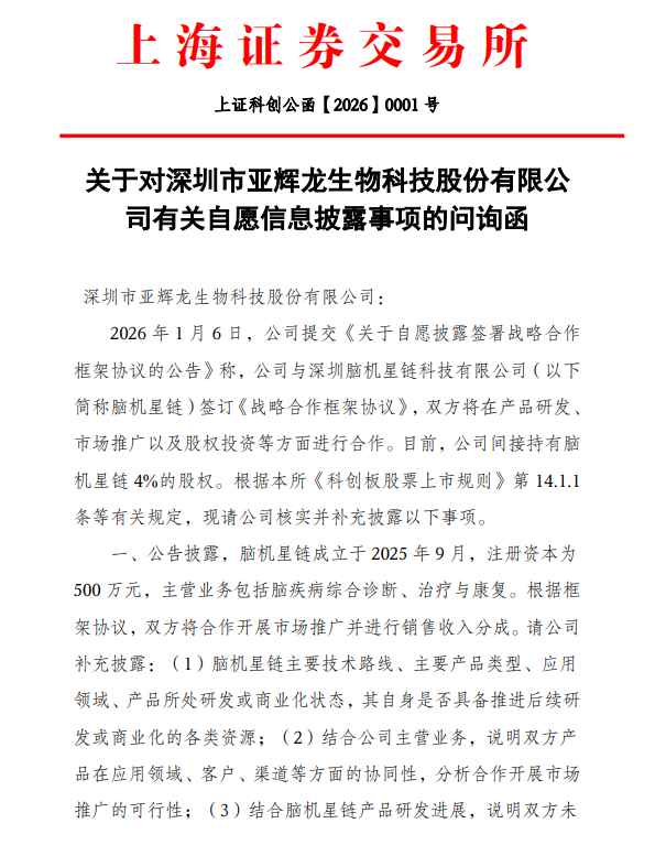 与此同时,上交所也出手,1月6日向亚辉龙发出问询函,要求公司就披露的战略合作框架协议补充披露。此前1月5日晚,亚辉龙公告透露,公司与深圳脑机星链科技有限公司(以下简称“脑机星链”)签订《战略合作框架协议》,双方将在产品研发、市场推广以及股权投资等方面进行合作。目前,公司间接持有脑机星链4%的股权。上交所在问询函中要求亚辉龙补充披露脑机星链主要技术路线、主要产品类型、应用 领域、产品所处研发或商业化状态,其自身是否具备推进后续研发或商业化的各类资源,公司未来拟对脑机星链进行股权投资或资金支持的具体安排和形式等。