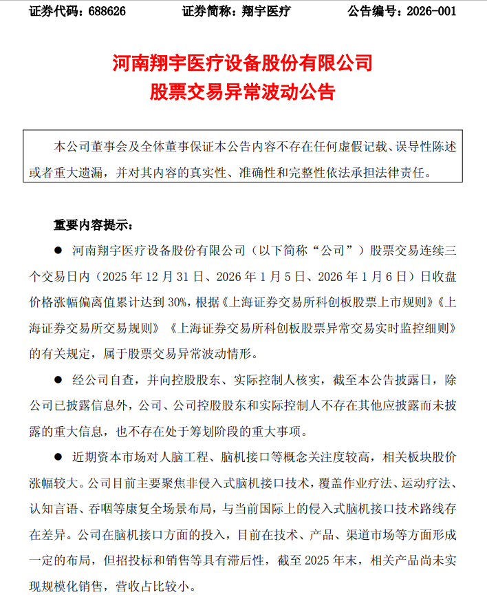 近期,脑机接口等概念股持续飙涨。截至1月6日,已有多只概念股连续三个交易日收盘价涨幅偏离值累计达到30%。对此,多家上市公司1月6日晚发布股票交易异常波动公告,称在脑机接口领域的新产品仍处于市场培育初期,且与国际主流存在显著技术路径差异。