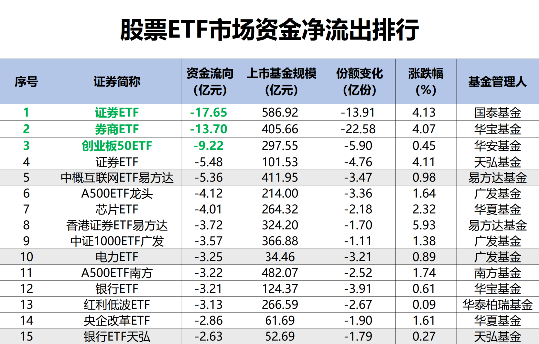 证券ETF、创业板50ETF等净流出靠前