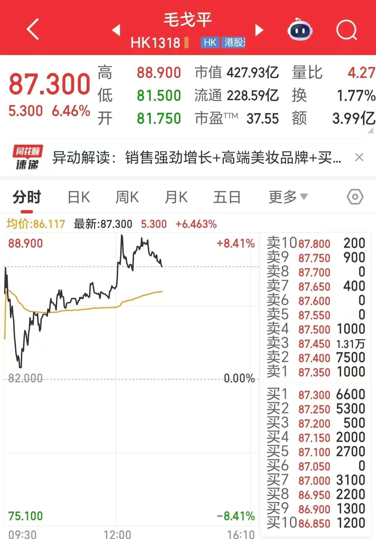 1月7日,毛戈平股价涨幅一度超过8%。截至发稿前,该股股价涨幅为6.46%,报87.30港元/股,市值为427.93亿港元。