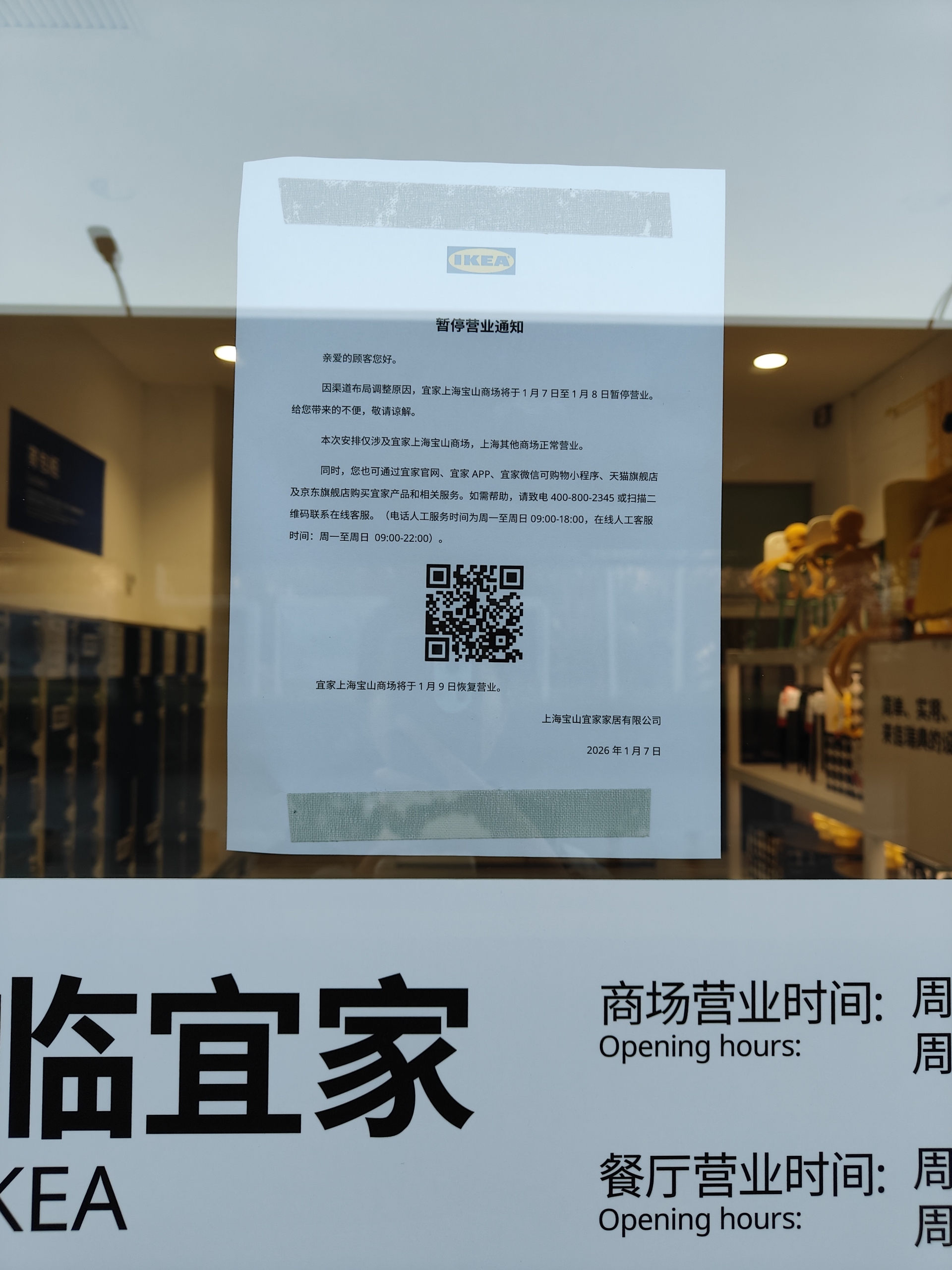 上述通知写着:“因渠道布局调整原因,宜家上海宝山商场将于1月7日至1月8日暂停营业。本次安排仅涉及宜家上海宝山商场,上海其他商场正常营业。”
