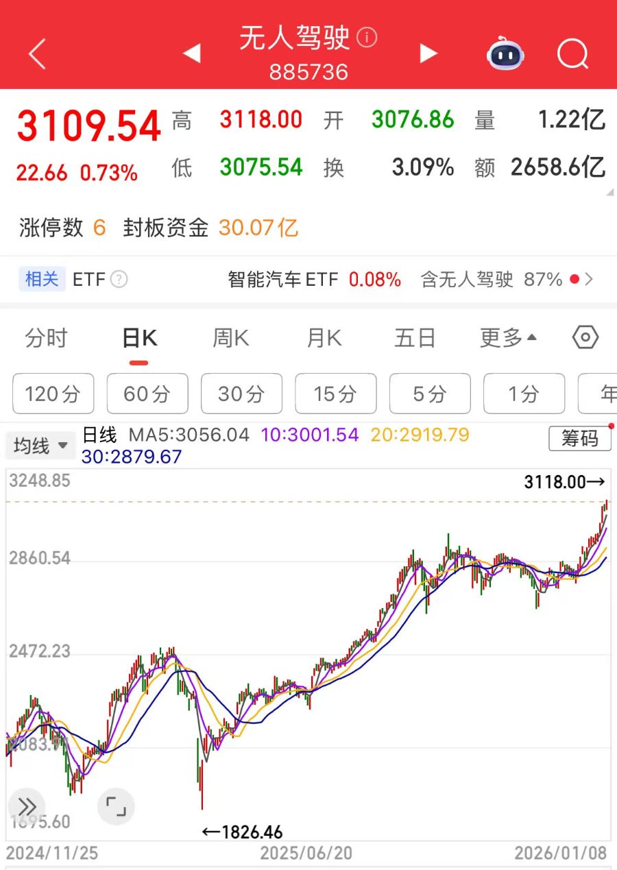 2025年,无人驾驶板块整体表现强劲,根据同花顺IFIND数据,无人驾驶指数(885736)全年涨跌幅为45.35%。截至1月8日午间收盘,无人驾驶板块涨幅0.65%。