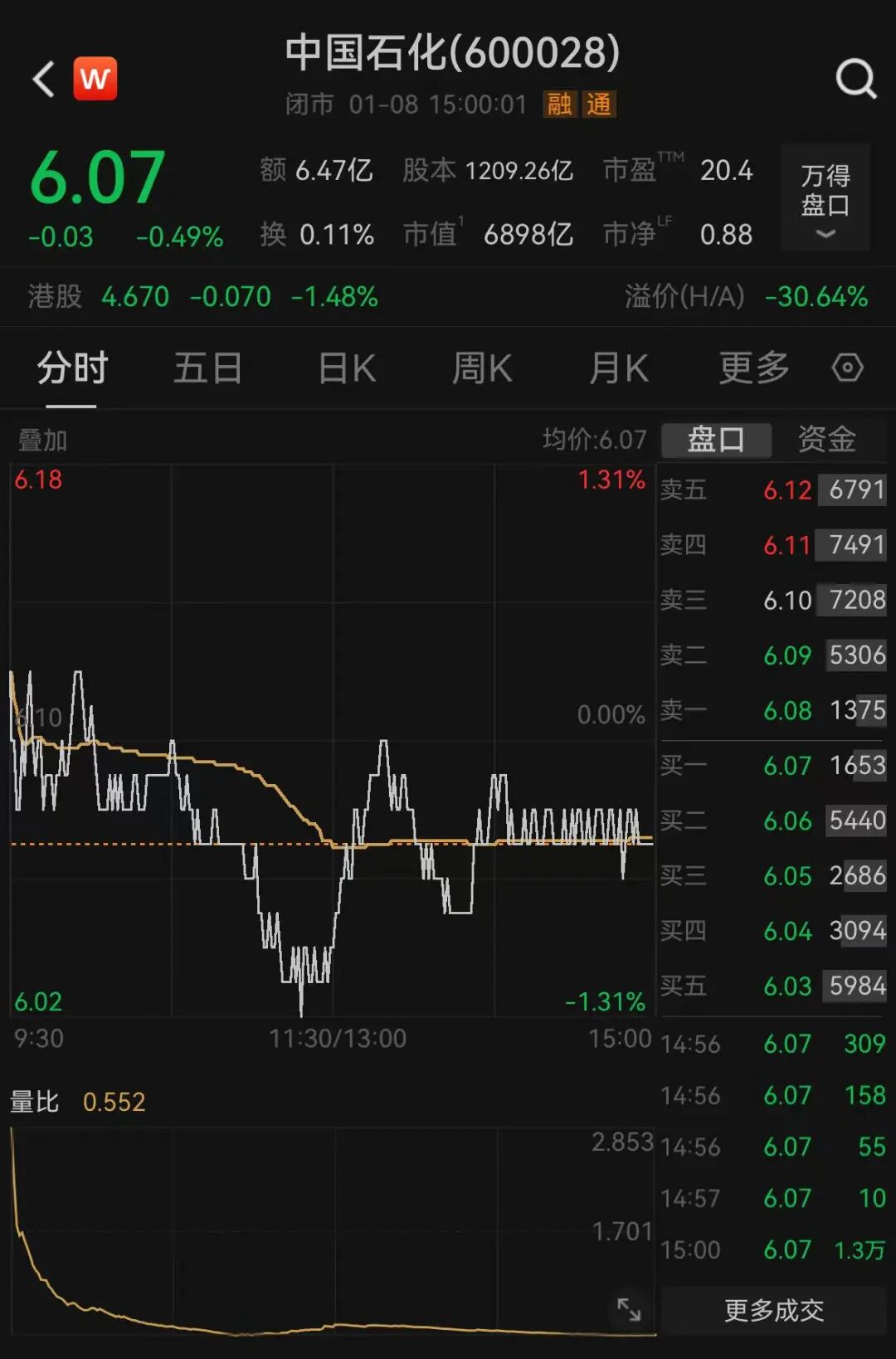 截至今日收盘,中国石化股价报6.07元/股,最新市值6898亿元。
