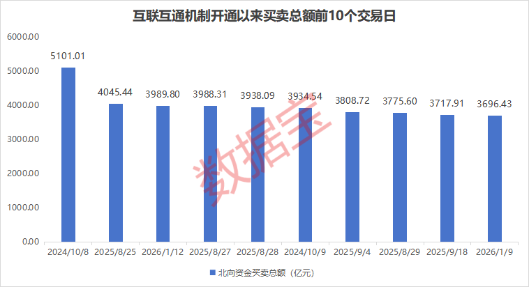 人民财讯1月12日电,A股市场持续走强,北向资金活跃度也稳步提升。1月12日,北向资金买入和卖出成交额合计3989.80亿元,较前一日增长7.94%,且连续2日增长,单日买卖总成交额创互联互通机制开通以来第三高,仅次于2024年10月8日以及2025年8月25日的成交额。其中,沪股通成交额1728.58亿元;深股通成交额2261.22亿元,成交额创历史第二高,仅次于2024年10月8日。