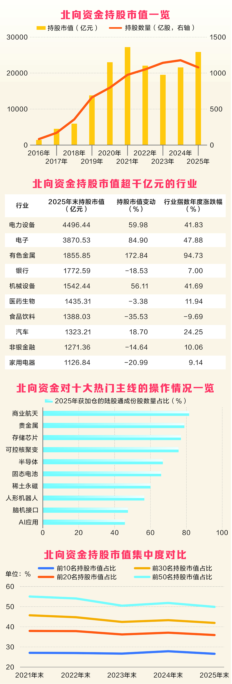 按北向资金持股市值排序,截至2025年12月31日,前20名公司获北向资金持股市值合计超过9300亿元,占北向资金持股总市值比例首次低于36%,较2021年末下降2个百分点以上。前50名的公司获北向资金持股市值为1.29万亿元,占北向资金持股总市值比例为49.92%,较2021年末下降超5个百分点。