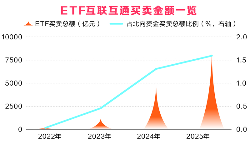 随着标的范围的持续扩容,ETF通的交易活跃度逐年攀升,北向资金借道ETF入场意愿显著提升。数据显示,2025年北向资金ETF买卖总额超过8100亿元,相比2024年的4600多亿元,大幅提升76%,买卖金额占北向资金买卖总额的比例达到1.62%,买卖金额及占比均创出历史新高。