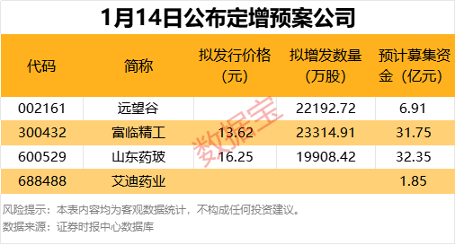 1月14日共有4家公司公布非公开发行预案。股价表现看,富临精工早盘高开后最高涨超18%,其余3股早盘均小幅上涨。