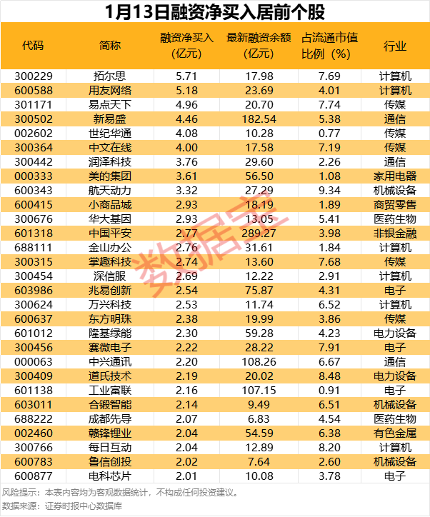具体到个股,1月13日获融资净买入在1亿元以上的有89只,其中,9只融资净买入额超3亿元。拓尔思融资净买入额居首,当日净买入5.71亿元;其次是用友网络、易点天下,融资净买入金额分别为5.18亿元、4.96亿元;融资净买入金额居前的还有新易盛、世纪华通、中文在线等。