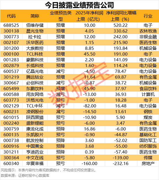 今日共有25家公司公布业绩预告,业绩预告类型来看,预增10家,预降4家,预亏6家,减亏5家。以预计净利润同比增幅上限统计,佰维存储、晨光生物、拉卡拉等8家公司预计2025年净利润同比增幅超100%。