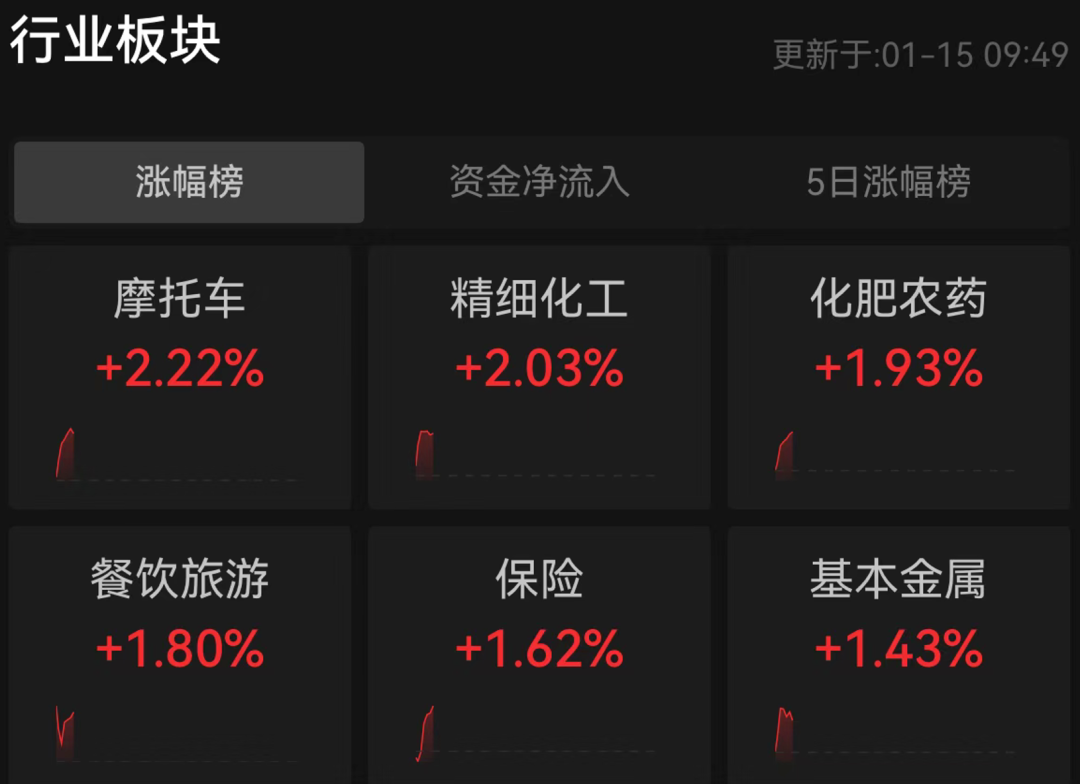1月15日开盘,A股三大指数集体低开后快速翻红,截至发稿,上证指数、创业板指再次转跌。摩托车、精细化工、化肥农药、餐饮旅游等板块涨幅居前。