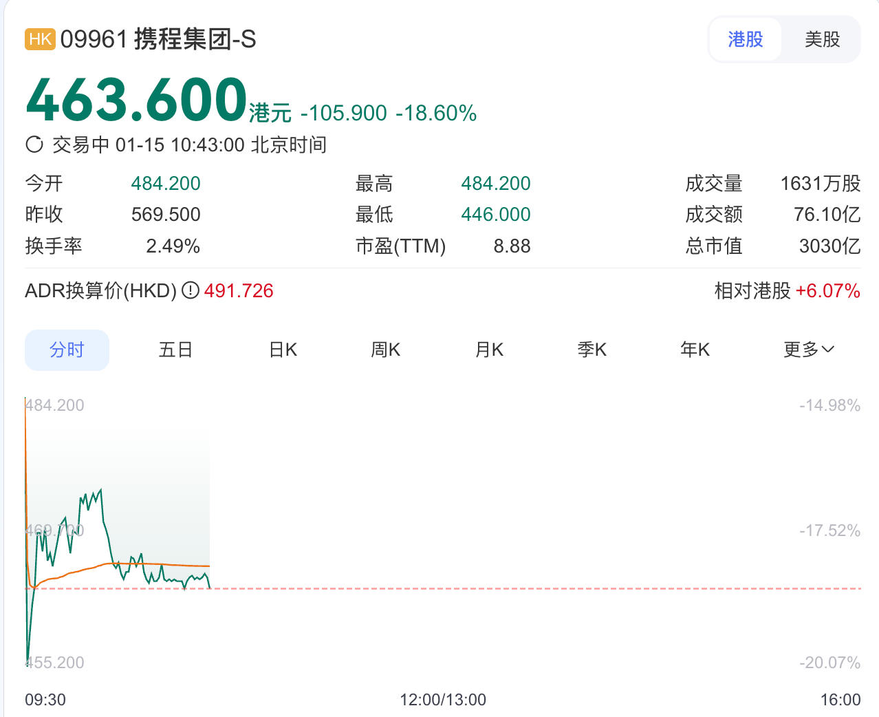 1月15日,港股开盘携程集团(09961.HK)以484.2港元大幅低开,跌幅达14.98%。截至发稿,携程股价进一步下探至463港元,跌幅扩大至18.6%,成交额超76亿港元,换手率升至2.4%,总市值3030亿港元。