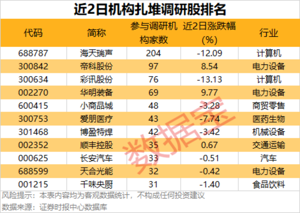 近两个交易日(1月15日至1月16日)共有82家公司公告机构调研记录。其中,11家公司获30家以上机构扎堆调研,海天瑞声最受关注,有204家机构调研。