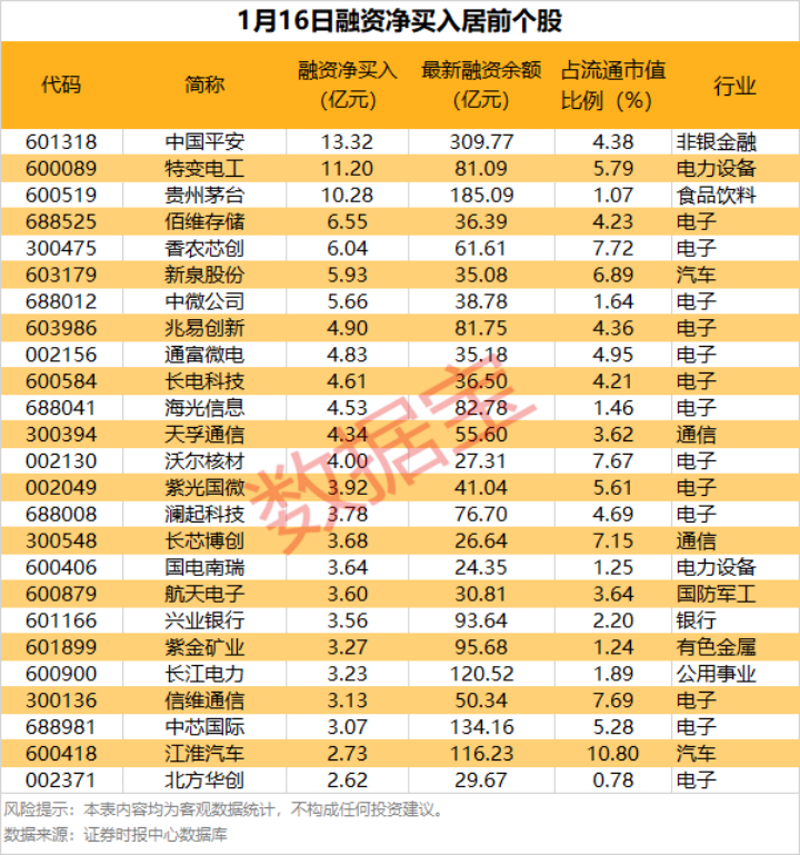 具体到个股,1月16日获融资净买入1亿元以上的有76只,其中,7只股融资净买入额超亿元。中国平安融资净买入额居首,当日净买入13.32亿元,其次是特变电工、贵州茅台,融资净买入金额分别为11.20亿元、10.28亿元,融资净买入金额居前的还有佰维存储、香农芯创、新泉股份等。