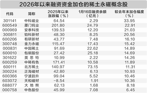 从融资资金来看,截至1月16日,稀土永磁板块中,24只两融标的个股融资余额合计为313.53亿元,较去年末增加10%以上,其中20只标的获融资资金加仓,14只个股加仓幅度超过10%,4只个股加仓超过20%。