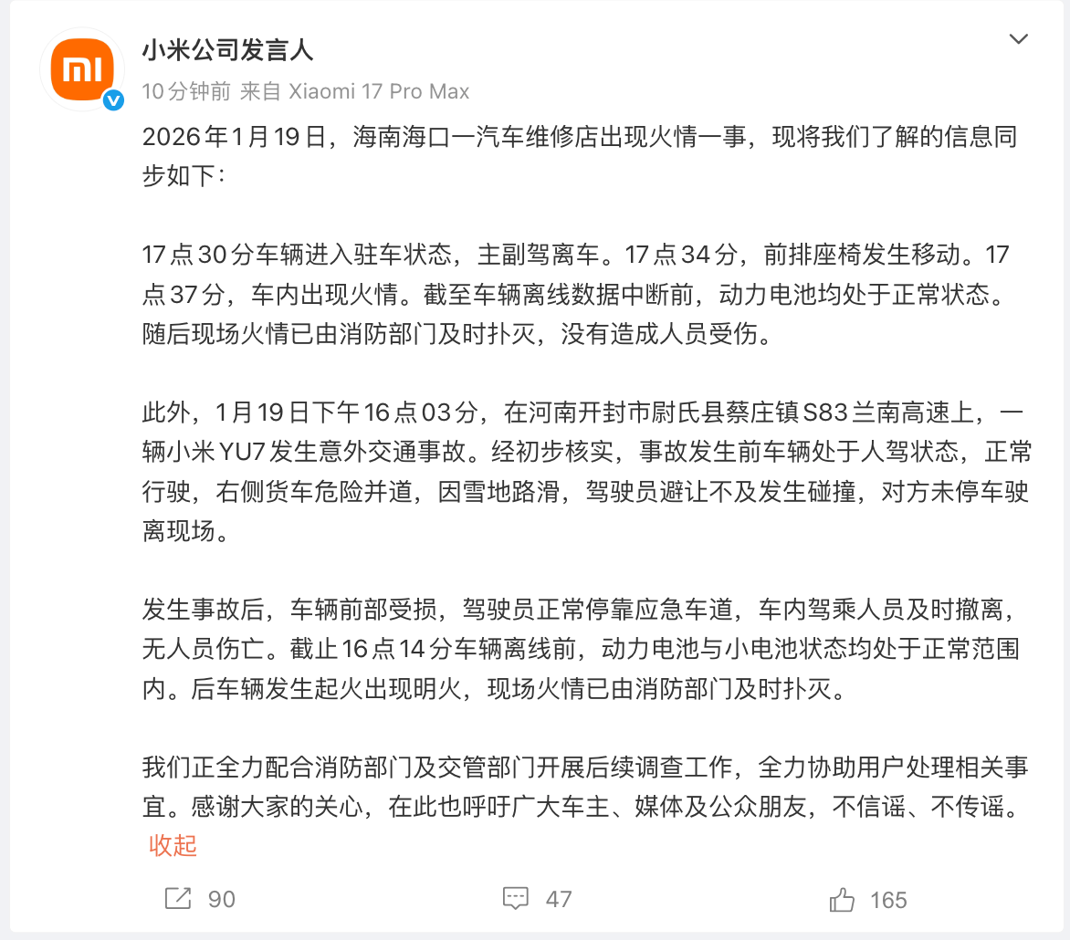 人民财讯1月20日电,小米公司发言人发文称,2026年1月19日,海南海口一汽车维修店出现火情一事,现将了解的信息同步如下: