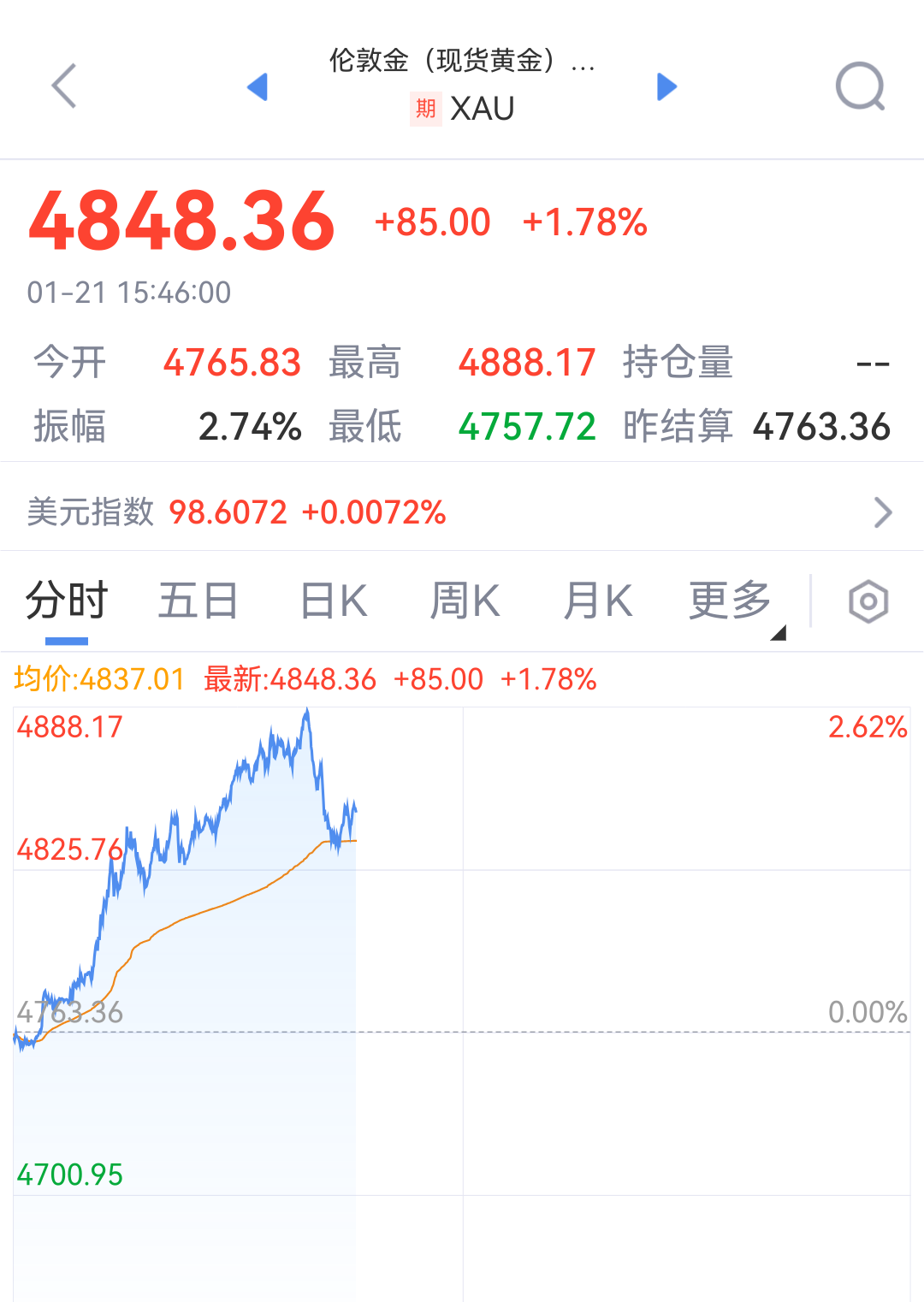 1月21日,伦敦金价格开盘后一路走高,一度触及4888.17美元/盎司,再创新高,随后直线下跌。与此同时,当日沪金期货主力合约2604在突破1100元/克后也开始回落,收盘报1092.3元/克。