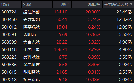 Wind实时监测数据显示,截至午间收盘,太空光伏概念获得逾79亿元主力资金净流入。其中捷佳伟创获得逾23亿元主力资金净流入,先导智能、隆基绿能均获得逾12亿元净流入。