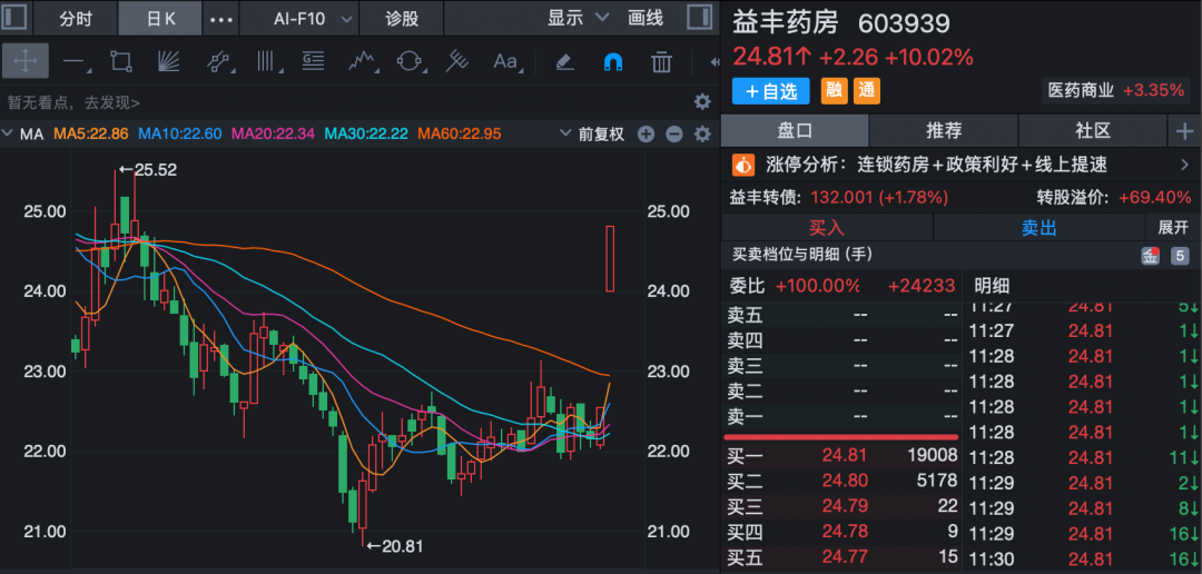 医药商业早间大幅高开高走,板块指数一度放量大涨逾4%,开盘不到1小时成交就超过昨日全天成交。益丰药房高开后秒速涨停,人民同泰也仅用约9分钟直线封板,大参林、润达医疗等涨幅居前。