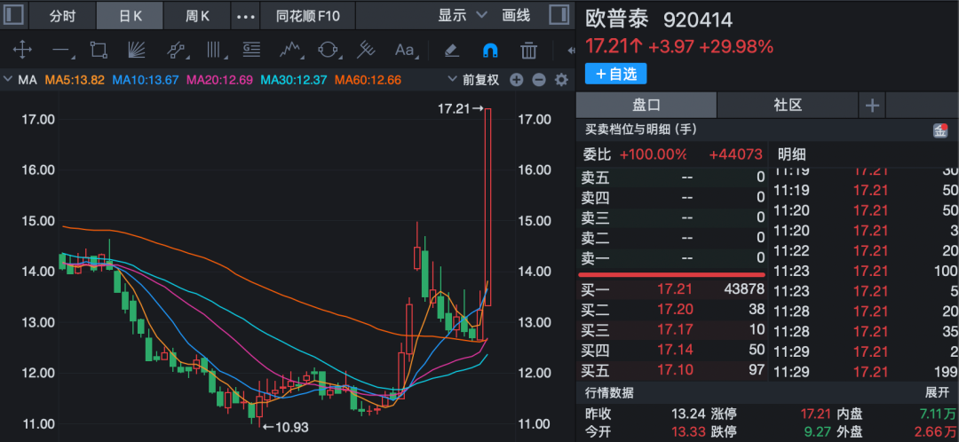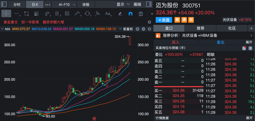 新能源产业全线走强,光伏领域最为活跃,光伏设备板块指数高开高走,盘中放量飙升近7%,半日成交超昨日全天成交。欧普泰(920414)开盘仅约2分钟垂直30%涨停,迈为股份也仅约5分钟20%涨停,连城数控、正泰电源等逾30股涨停或涨超10%。
