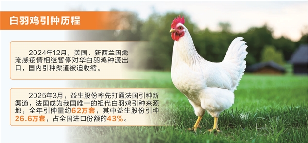 回溯行业引种历程,2024年12月,美国、新西兰因禽流感疫情相继暂停对华白羽鸡种源出口,国内引种渠道被迫收缩。直至2025年3月,益生股份率先打通法国引种新渠道,法国成为我国唯一的祖代白羽鸡引种来源地,全年引种量约62万套,同比下降超过10%,其中益生股份引种26.6万套,占全国进口份额的43%。