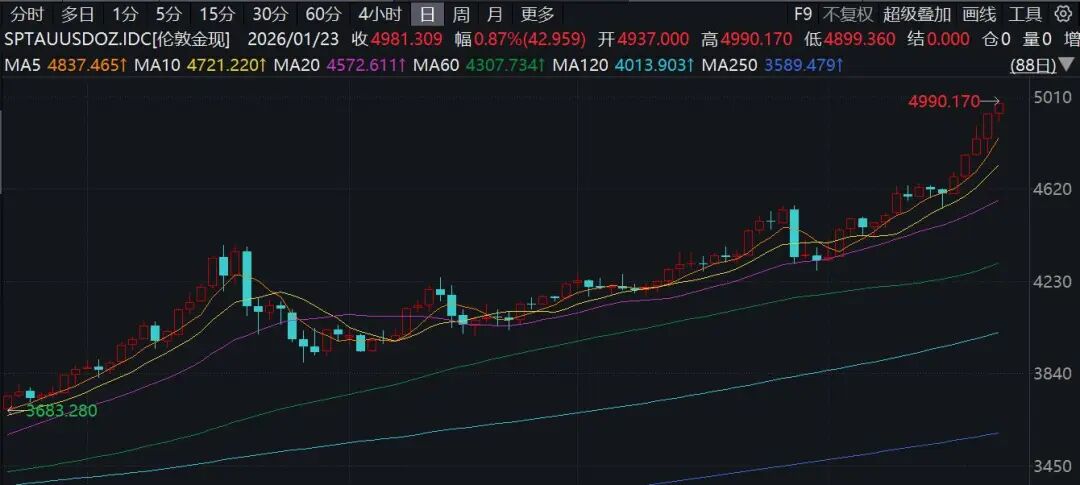由于地缘政治动荡和对美国降息的预期,投资者纷纷涌入避险资产。1月23日现货白银首次突破100美元/盎司,最高触及103美元/盎司,大涨逾7%。黄金一度上涨超1%再创新高,逼近5000美元/盎司大关。