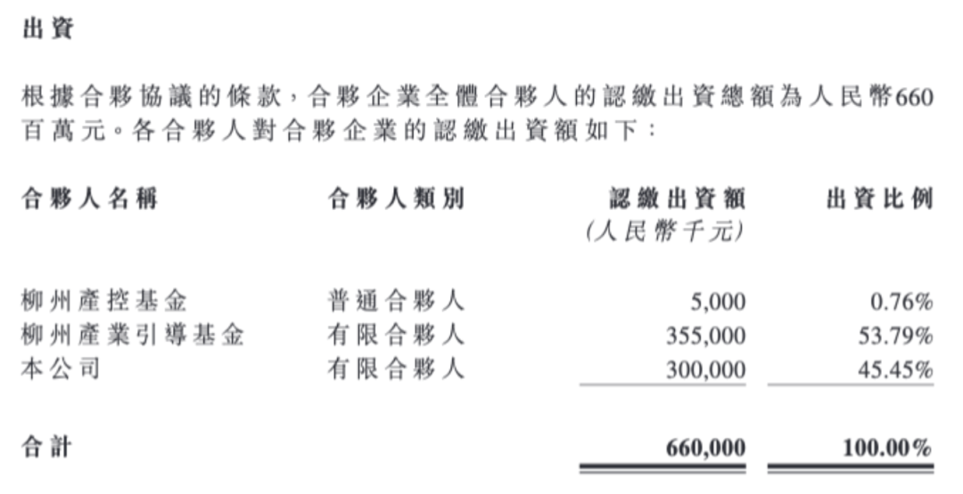 根据合伙协议的条款,合伙企业全体合伙人的出资总额为人民币6.6亿元,其中柳州产控基金出资人民币500万元,柳州产业引导基金出资人民币3.55亿元,优必选出资人民币3亿元。柳州产控基金担任合伙企业的普通合伙人及基金管理人。
