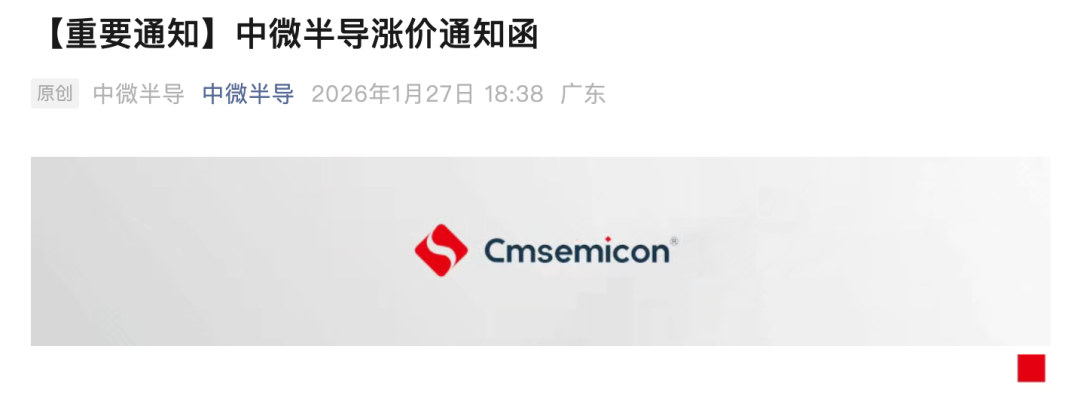 1月27日晚间,国产芯片厂商中微半导通过官方公众号发布了“涨价通知函”,公司表示,鉴于当前严峻的供需形势以及巨大的成本压力,经过慎重研究,决定于即日起对MCU、Nor flash等产品进行价格调整,涨价幅度15%—50%。