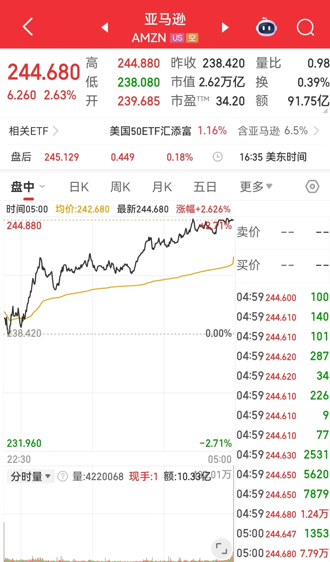 亚马逊涨2.63%,市值一夜增加669亿美元(约合人民币4653亿元)。