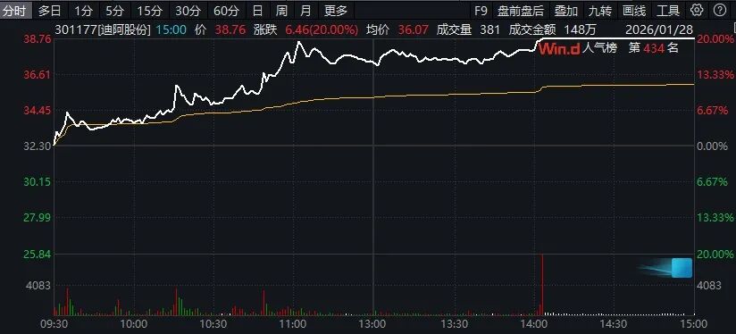 市场热点方面,黄金概念股表现炙热,板块指数放量飙升7.28%,创近1年半来最大涨幅,该指数今年以来18个交易日有13日创历史新高。飞南资源、晓程科技涨停,迪阿股份(301177)尾盘也封于20%涨停,此外、曼卡龙、中国黄金、白银有色等逾30股涨停或涨超10%。