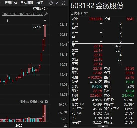其中,3连板金徽股份(603132)公告称,公司白银产品的收入占总营业收入的比重较低。2025年前三季度,公司实现营业收入11.8亿元,销售铅精矿(含银)收入3.82亿元,占公司总营业收入的比重为32.37%,销售白银收入1.47亿元,占公司营业收入的比重为12.46%。