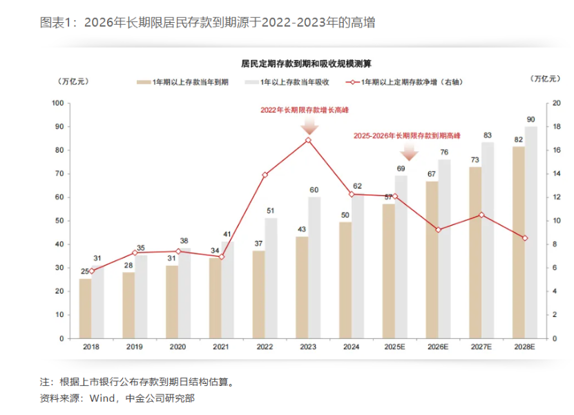 2026年,银行超50万亿元的天量高息定期存款到期,资金流向成为市场热议的话题。各家券商研究所测算的2026年到期定存规模不同,国信预计59万亿元—71万亿元,国金测算约70万亿元,中金测算为75万亿元,不过普遍预计超过50万亿元。