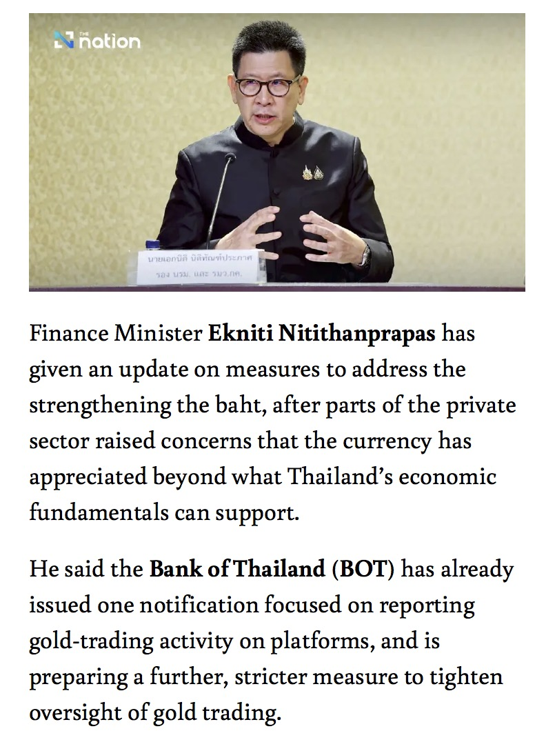 作为全球第七大、东盟第一大黄金交易市场,泰国黄金日交易额超过5万亿泰铢,其中线上交易占比高达65%,且普遍以泰铢报价结算。因此,黄金市场成为泰国汇率管控的关键点。有分析人士表示,国际资金参与线上黄金交易时的集中换汇行为,直接推升泰铢需求,而做空交易带来的高杠杆效应,更通过保证金追缴机制放大了泰铢需求,形成“升值助推循环”。此次新规并非孤立举措,而是泰国央行近期稳汇率政策组合拳的关键一环。